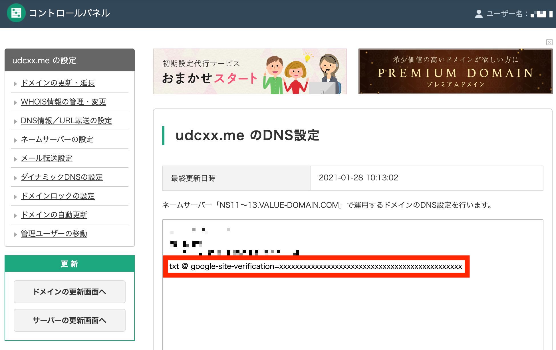 TXTレコード の部分を先程Google Search Consoleで取得したものと置き換えて、設定を保存すれば完了です。Google Search Console側でも「確認」ボタンを押して完了です。DNSレコードの書き換えなので反映までに時間がかかることがありますので気長に待ちましょう。