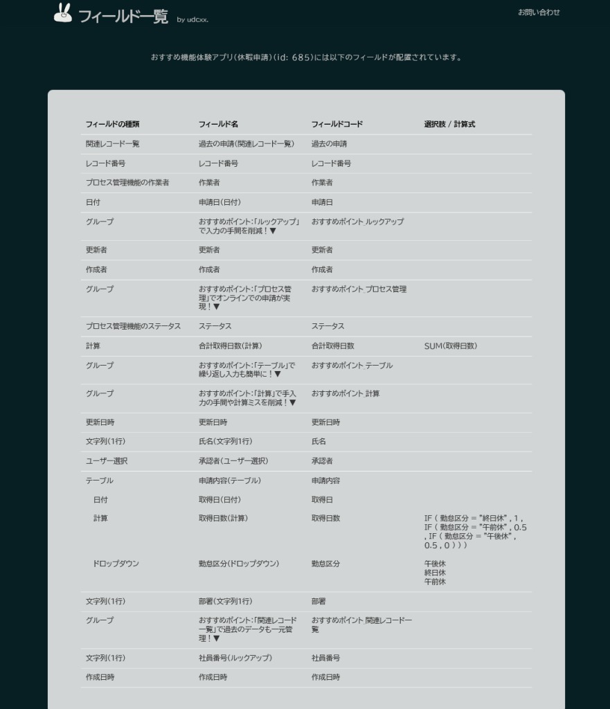せっかくなので、選択式フィールド(ドロップダウンやチェックボックスなど)の場合は選択肢を、自動計算が設定されているフィールドの場合は計算式もそれぞれ表示するようにしてみました。